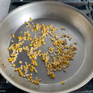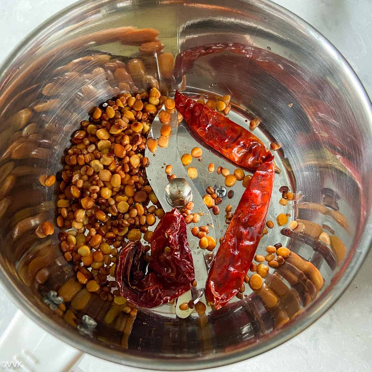 - Heat a pan or kadai and add ½ tsp of oil. When the oil is hot, add the urad dal and chana dal along with asafoetida and roast until the lentils are deep golden brown.