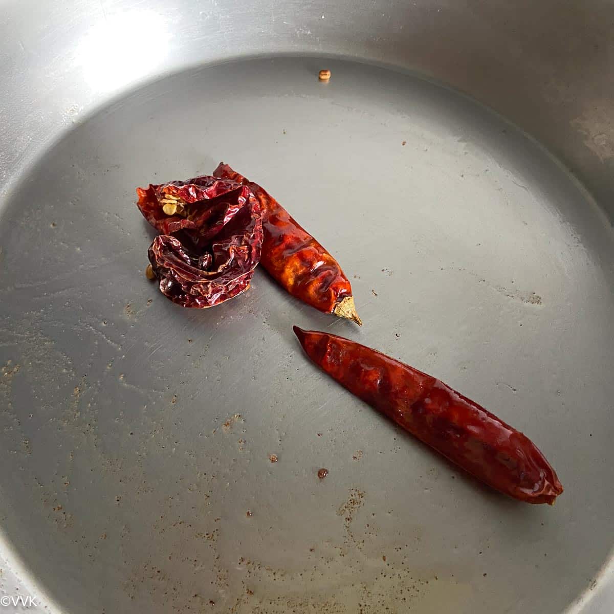 - Transfer the lentils to the mixer jar, and in the same pan, add the red chilies and roast them for a minute or until they become crisp and slightly charred.