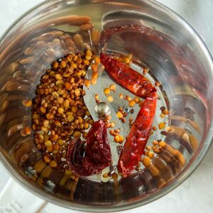 Chilies – I used regular dried red chilies and Kashmiri red chili for the color. You can use either one and adjust the amount to taste.