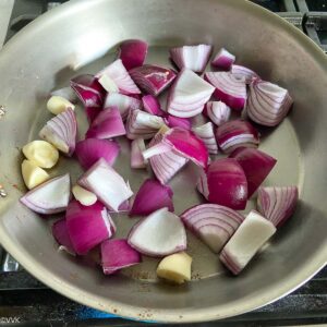 - In the same pan, add ½ more tsp of oil and add the chopped onion and garlic.