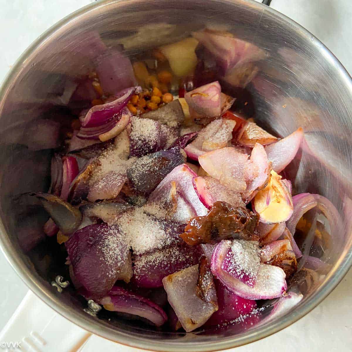 - Saute until the onions are soft or for about 5 to 7 minutes. Transfer the onions to the mixer jar and let it cool.