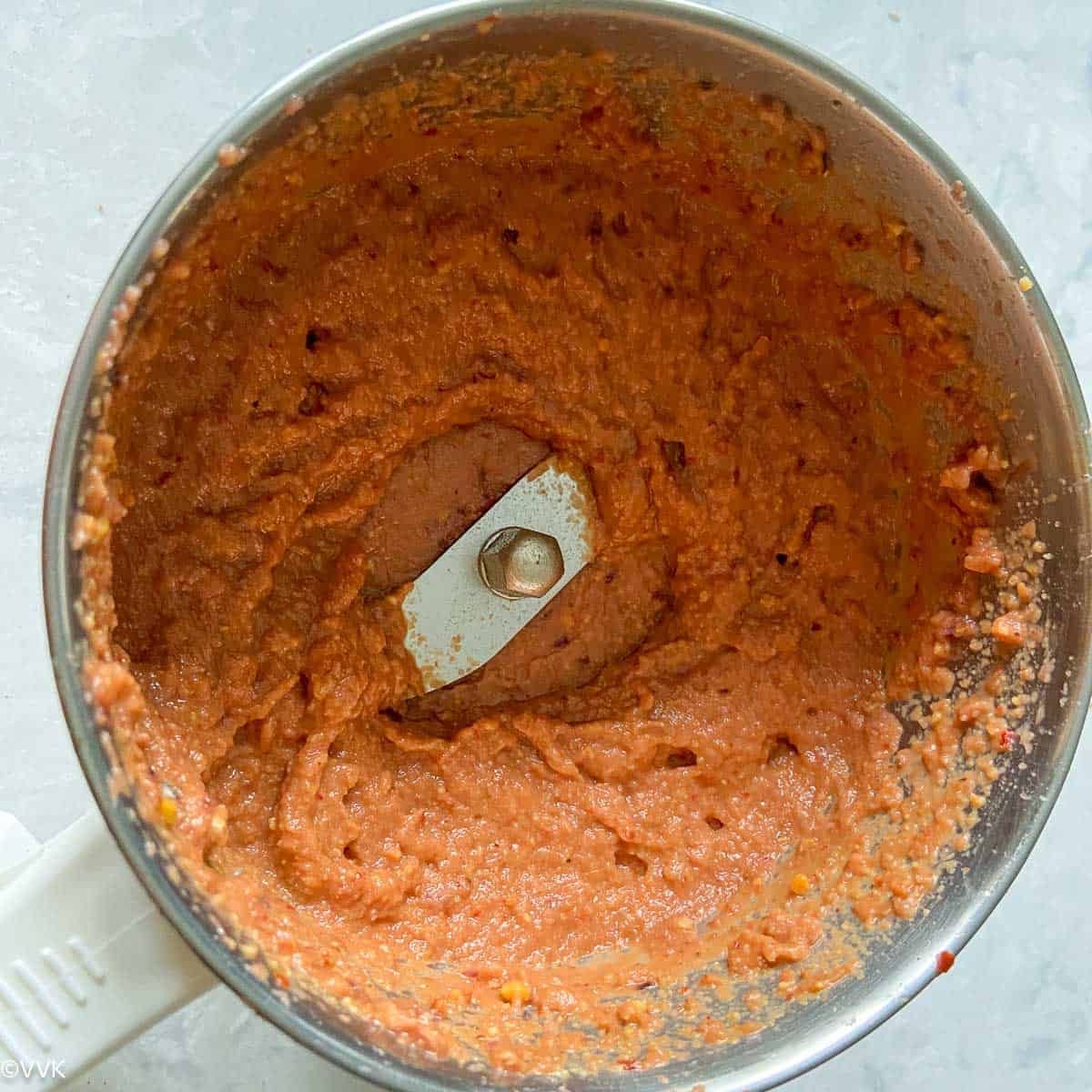 - Now add salt and tamarind paste and grind it using the required amount of water. You might not need the entire ¼ cup of water. So add as required.