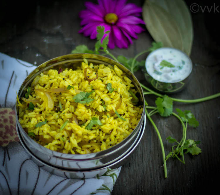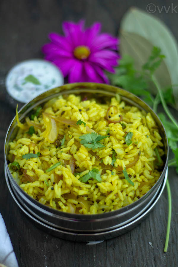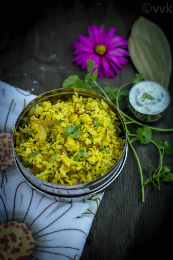 You can use leftover rice for this recipe, but I went with freshly made for today. Ensure the rice is cooled down completely. If I am packing for lunch, I make the rice overnight and allow it to cool. And in the morning I prepare the simple onion masala and mix the rice. That’s it.
