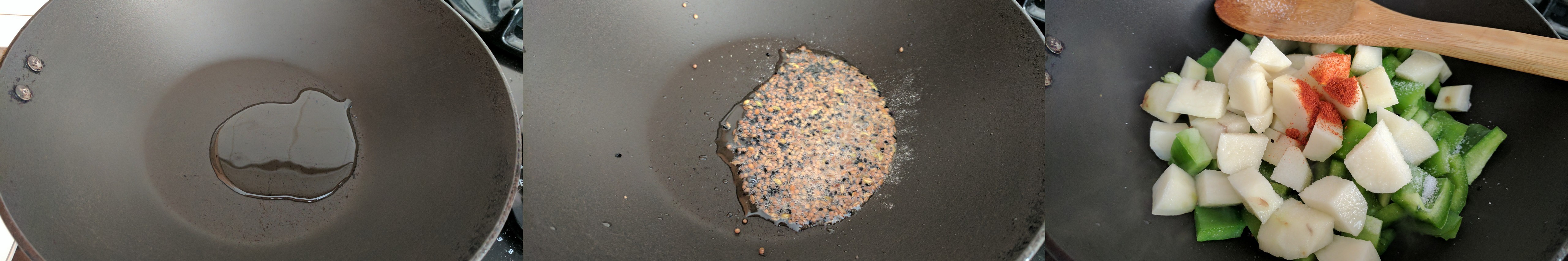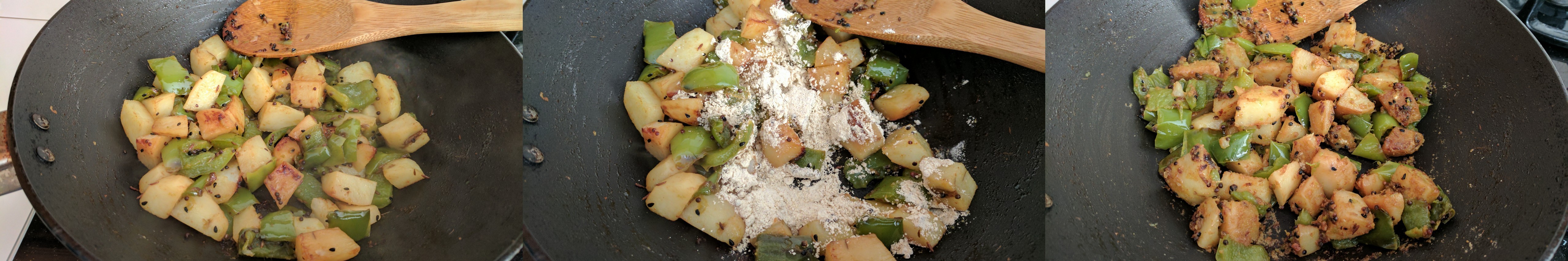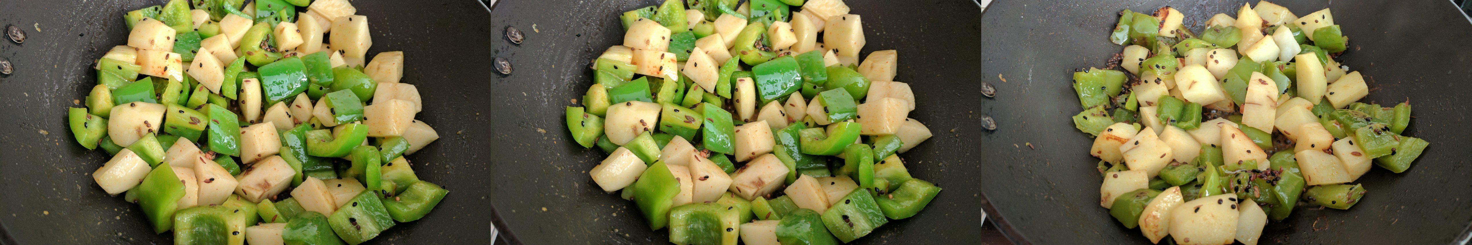 - As the mustard seeds start to splutter, add the chopped capsicum and potato.