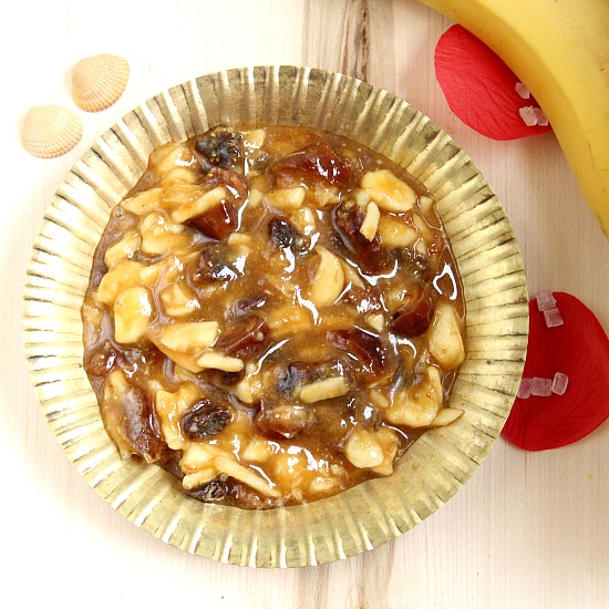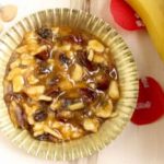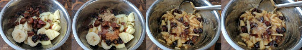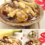 For this recipe I am using fresh banana and half an apple and for dry fruits I went with raisins, dried figs and dates of course. I had powdered jaggery at home and also cane/brown sugar. So used both for this recipe but you can always use either one. This is a super sweet prasadam as you can see we are using sweet fruits added with honey, jaggery and sugar candy. For additional flavor you can use cardamom powder but that’s completely optional. I went with ¼ tsp of cardamom powder.