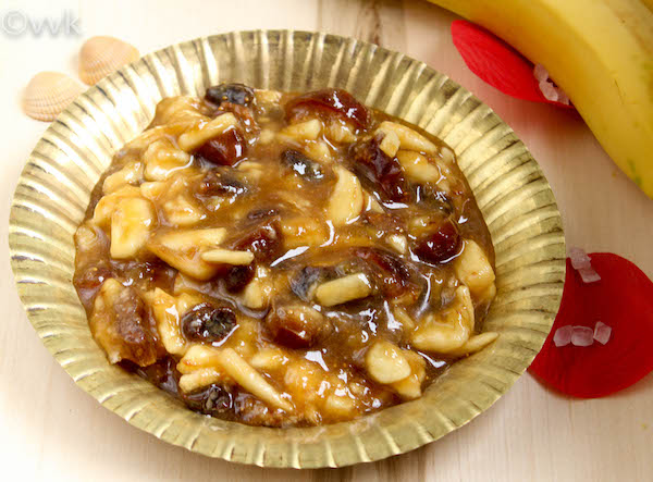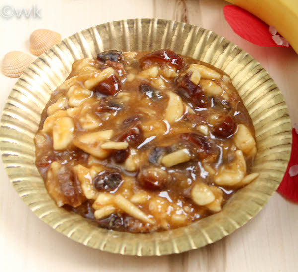Panchamritham is very famous in Pazhani murugan temple and you can see pretty much all the shops selling these Panchamrutham in the palani temple and also in the foot hills of palani temple. The main ingredient that we use in Panchamrutham is banana and the palani murugan temple prasadam uses Virupachi variety, specific to that location. You need fresh fruits especially banana and dry fruits like raisins and dates and jaggery, honey, sugar rock candy or kalkandu and edible camphor or pachai karpooram. Mix and mash it well. That’s it. Panchamritham is ready. It’s our own version of jam with jaggery. :-)