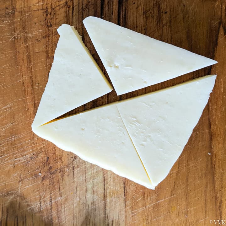 - Cut the paneer into shapes according to your preference. If it's for a party or get-together, I prefer this triangle shape.
