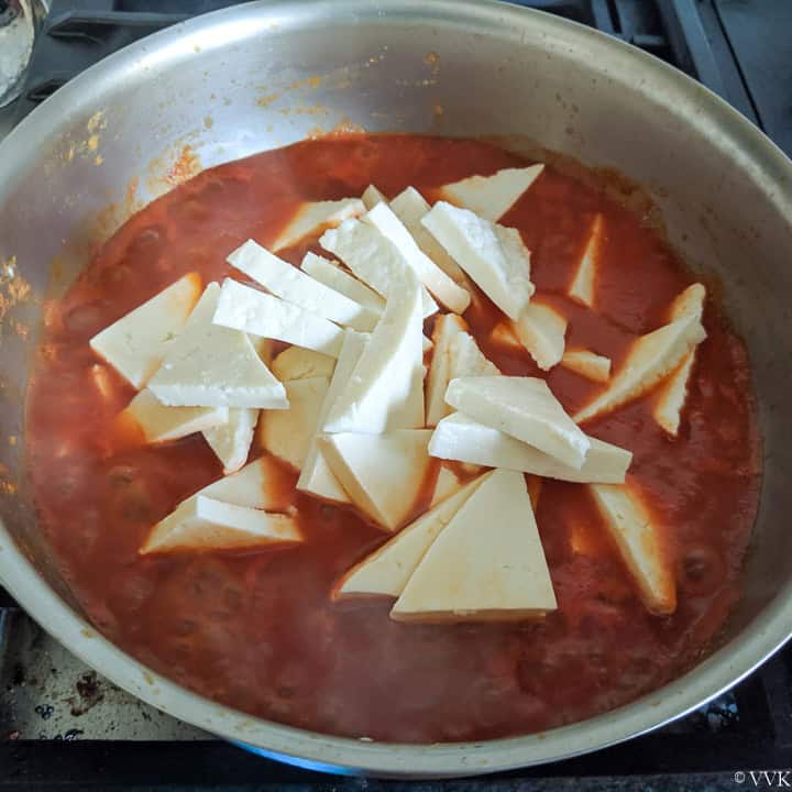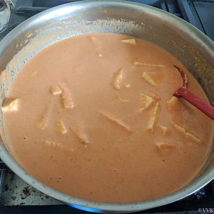 - Cook for 5 minutes and add all the paneer. Gently mix.