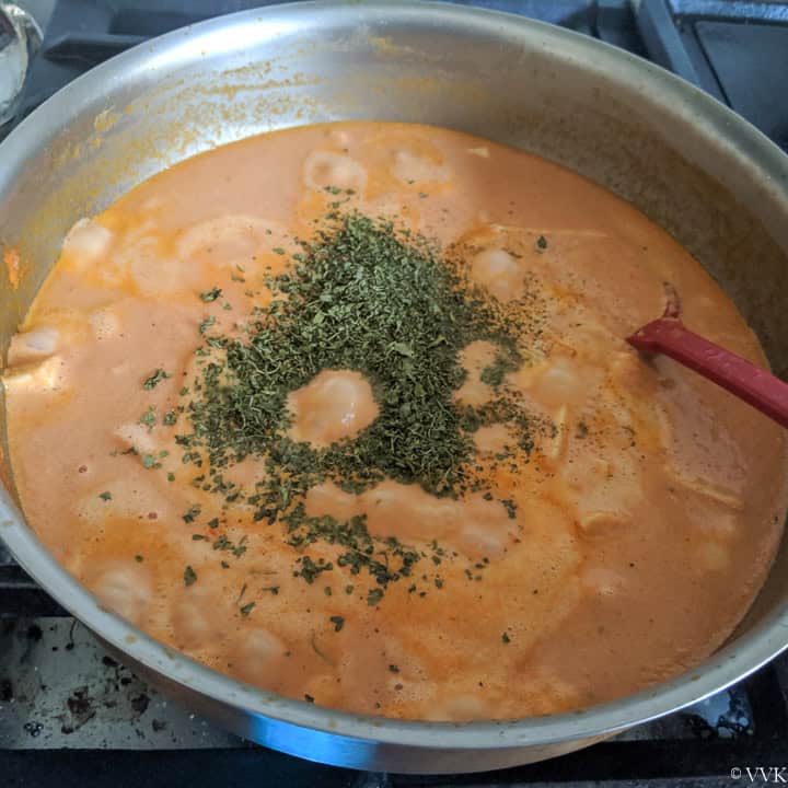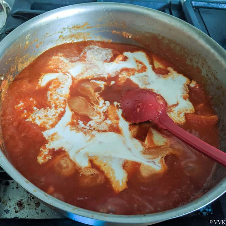 - Then add the cream right away and mix thoroughly. Reduce the heat to low and let it simmer for 4 to 5 minutes. As the bubble starts to form, turn off the heat. Crush the fenugreek leaves and add it.