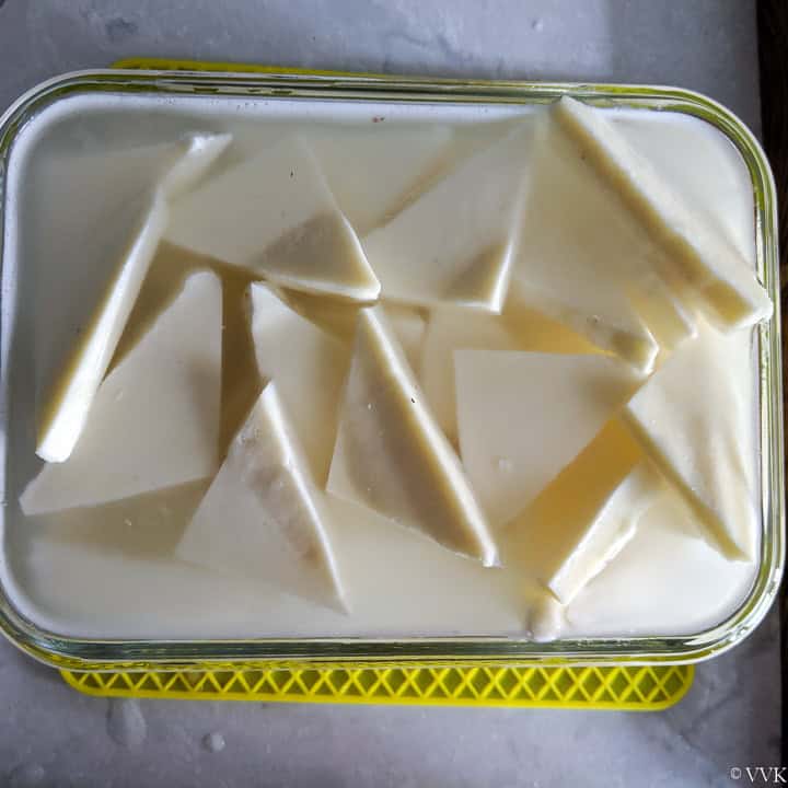 - Cut the paneer into shapes according to your preference. If it’s for a party or get-together, I prefer this triangle shape.