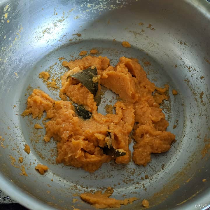 - Cook thoroughly until the raw smell goes off, and all the moisture is absorbed, as shown in the picture. This is an important step. Make sure you cook this paste until the moisture is absorbed. It usually takes about 8 to 10 minutes over medium heat.