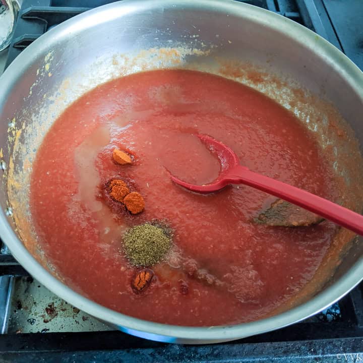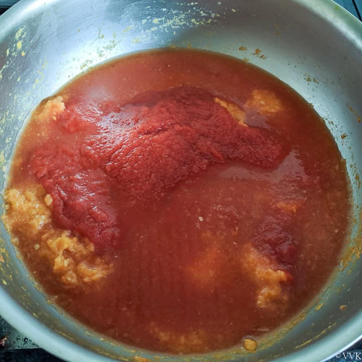 - Now add the tomato puree and 1.5 cups of water. Mix well.