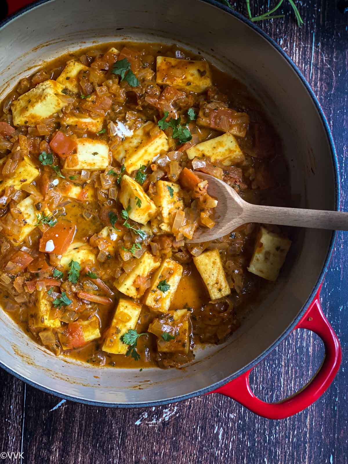 Paneer curry recipe with Kolhapuri masala! Call it Kolhapuri paneer or paneer Kolhapuri, this recipe with store-bought Kolhapuri masala comes together in less than 30 minutes.