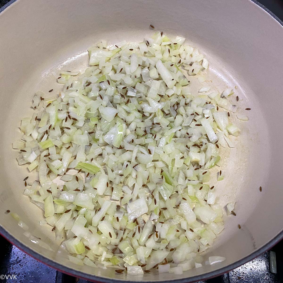 - Heat a saucepan/Dutch oven and add the oil. When the oil is hot, add the cumin seeds and let them sizzle. Then add the chopped onion and saute until the onions turn soft.