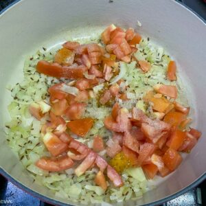 - Then add the tomatoes and salt. Cover and cook until the tomatoes are soft and mushy.