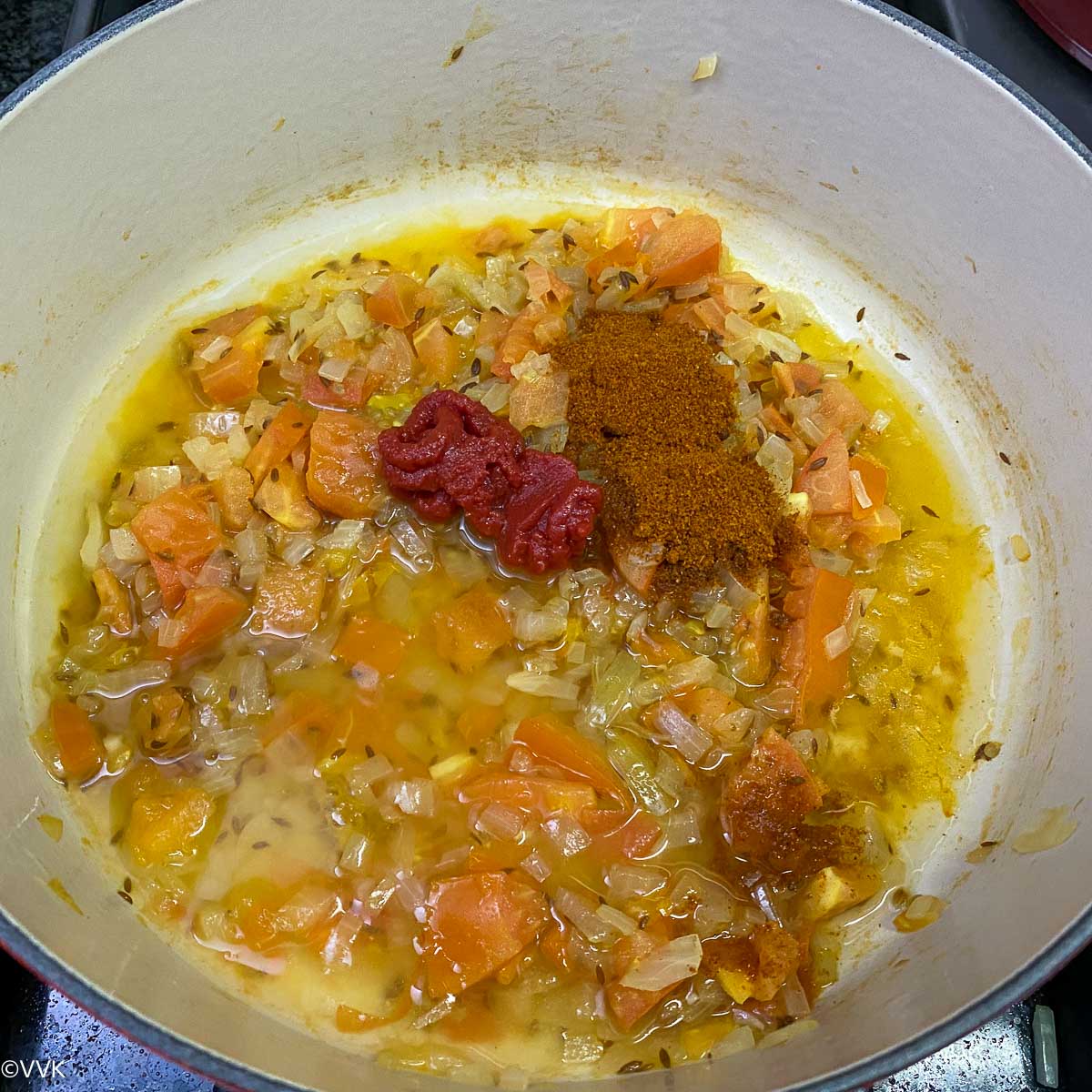 - Remove the lid, add the tomato paste, Kolhapuri masala, and ¾ cup of water.