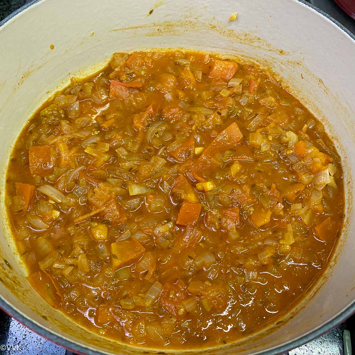 Luckily I have two friends from Maharashtra, and they have always helped with Maharashtrian recipes, be it the simple amti or the pav bhaji. I have wanted to try this veg Kolhapuri but kept postponing it. I found Kolhapuri masala in the Indian groceries earlier this year and picked it right away. And I thought of deciphering it and validate with my friends, and I am working on it. :-) Meanwhile, I started using this spice for making curries, and we are totally in love with it.