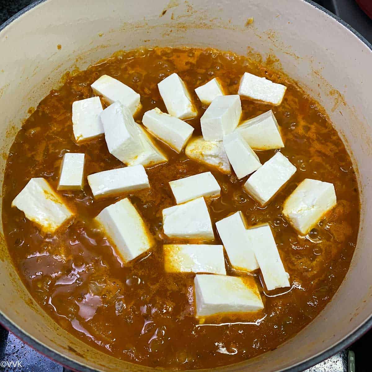 - After about 5 minutes, add jaggery and the paneer cubes. Reduce the heat to medium-low and cook for 3 to 4 minutes.