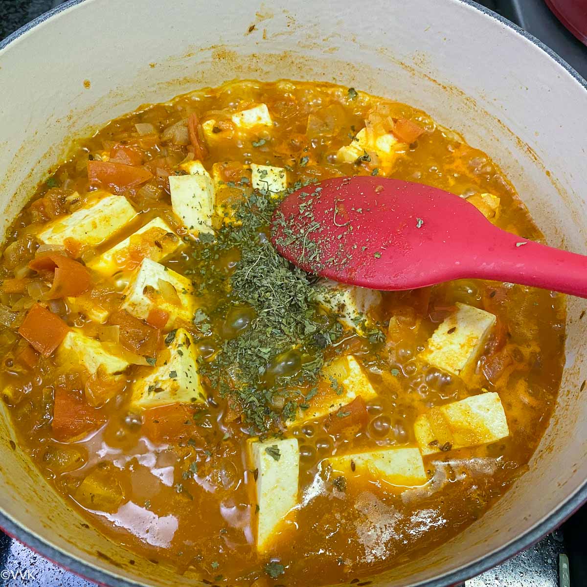 - Now add the crushed kasoori methi and mix well. Cook for a couple of minutes and turn off the heat.