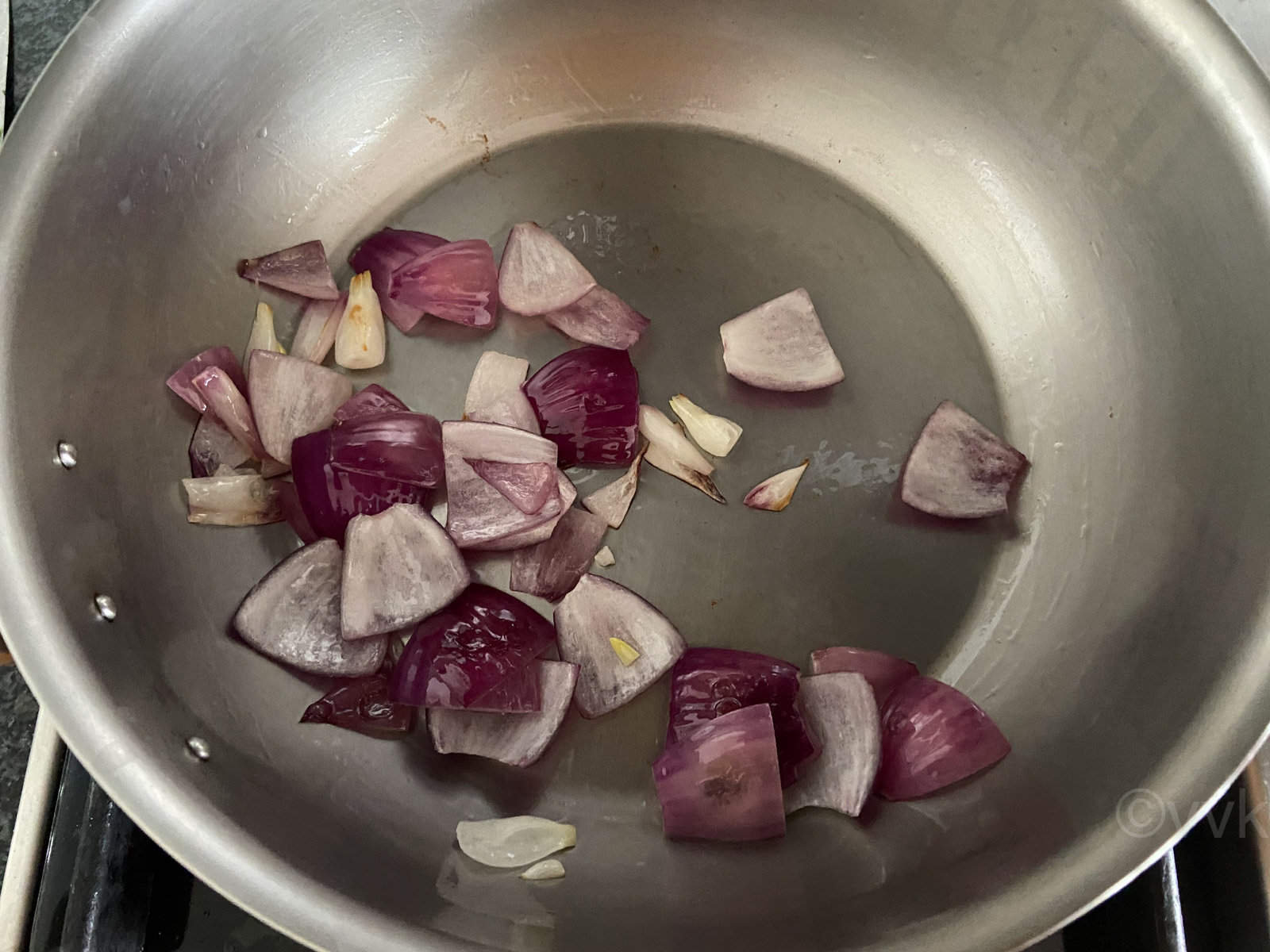 - Heat a pan or kadai and add 1 tsp of oil. When the oil is hot, add the onion petals and saute until it turns slightly soft. Transfer it to a plate and set them aside. Ensure to retain the crunch and not overcook the onion petals.
