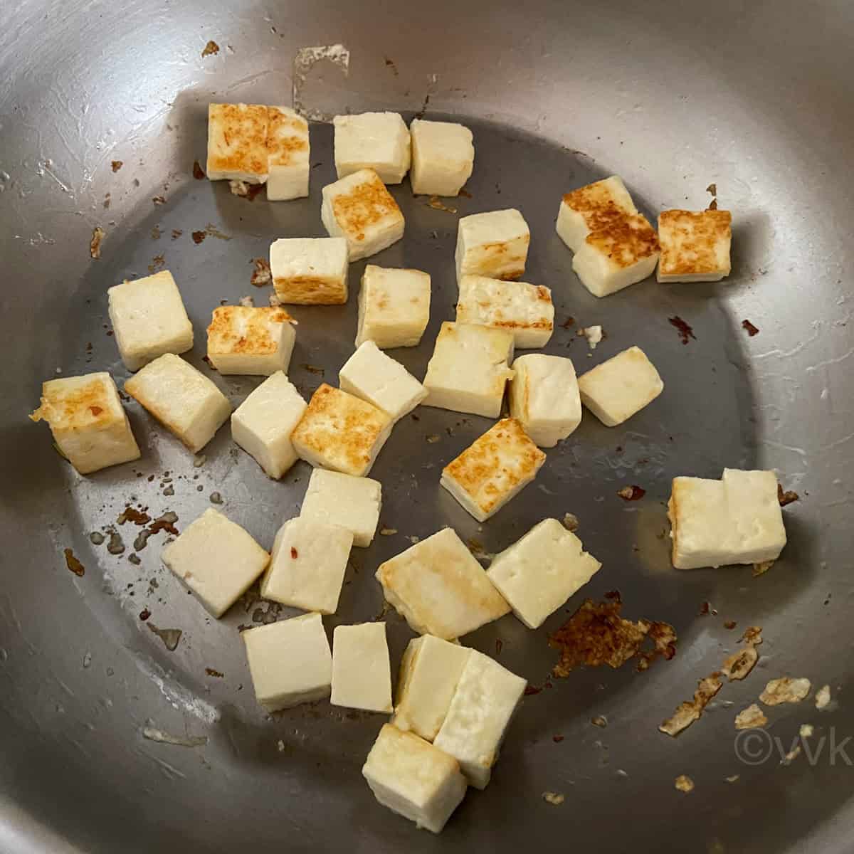 - In the same kadai, add the paneer cubes and saute them till it turns light golden brown. This step is optional, though. Transfer it and set it aside.