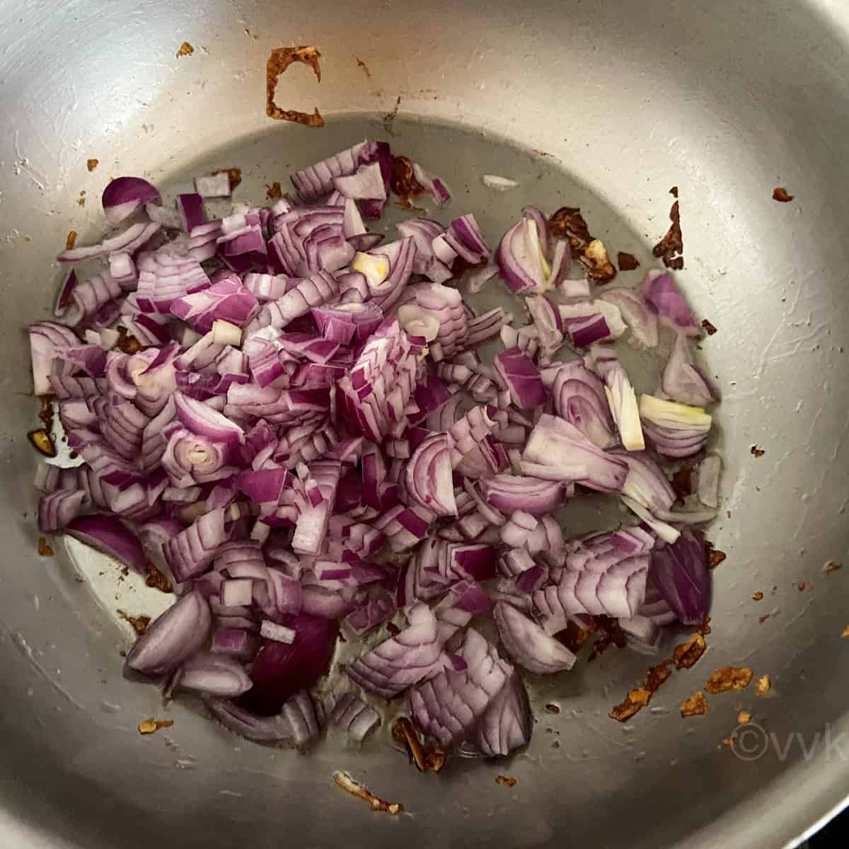 - Add the remaining 2 tsps of oil to the kadai and when it is hot, add the finely chopped shallots, onions, and ginger garlic paste. Saute until the onions turn soft and translucent.