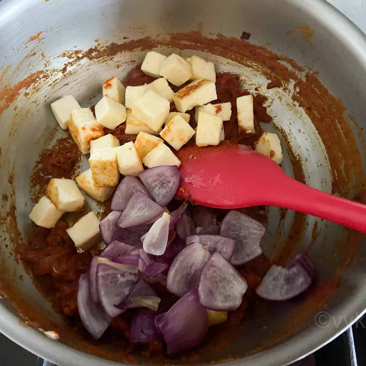 Paneer: I went with an equal measure of paneer and onion. You can use homemade paneer or store-bought paneer.
