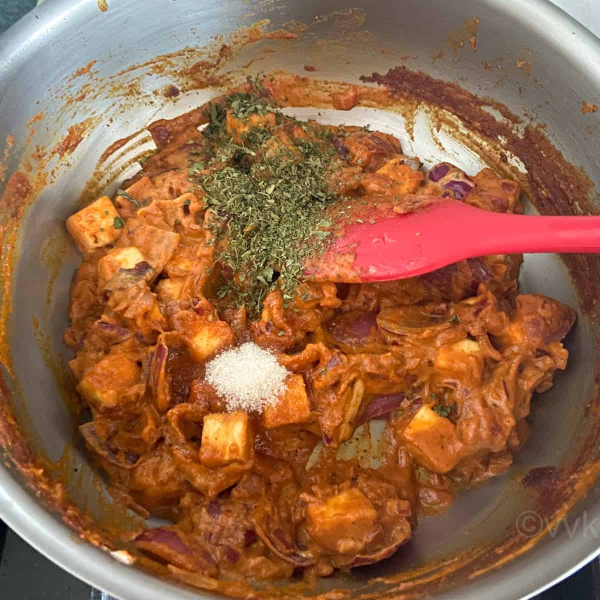 - Next, add the sugar and crushed fenugreek leaves. Mix and cook again for a couple of minutes.