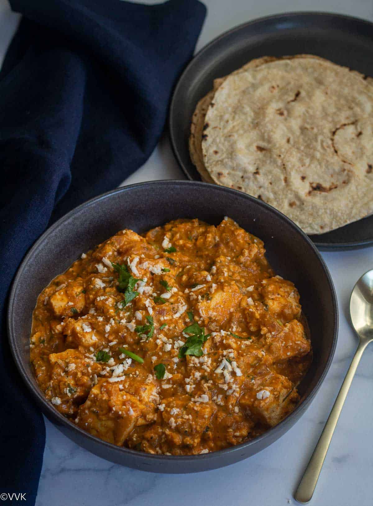 If you look into the ingredients, it has most of the ingredients, like in paneer butter masala/paneer makhani. So what’s the difference? It all comes to texture. When the gravy for paneer butter masala is smooth, this is bit chunky thanks to onions and the grated paneer. Yes, we add grated paneer, too, and you will enjoy the goodness of paneer in every bite.