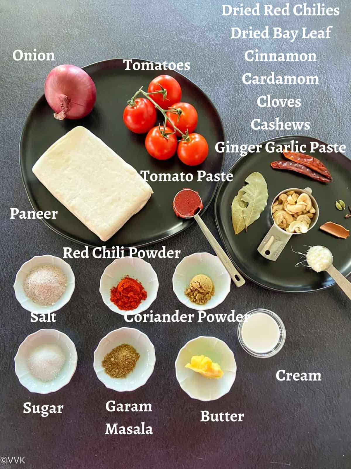 Other ingredients: Apart from these ingredients, we also need dried bay leaves, butter, onion, ginger-garlic paste, salt, sugar, cream (I used half and a half), dried fenugreek leaves, cilantro, and water.
