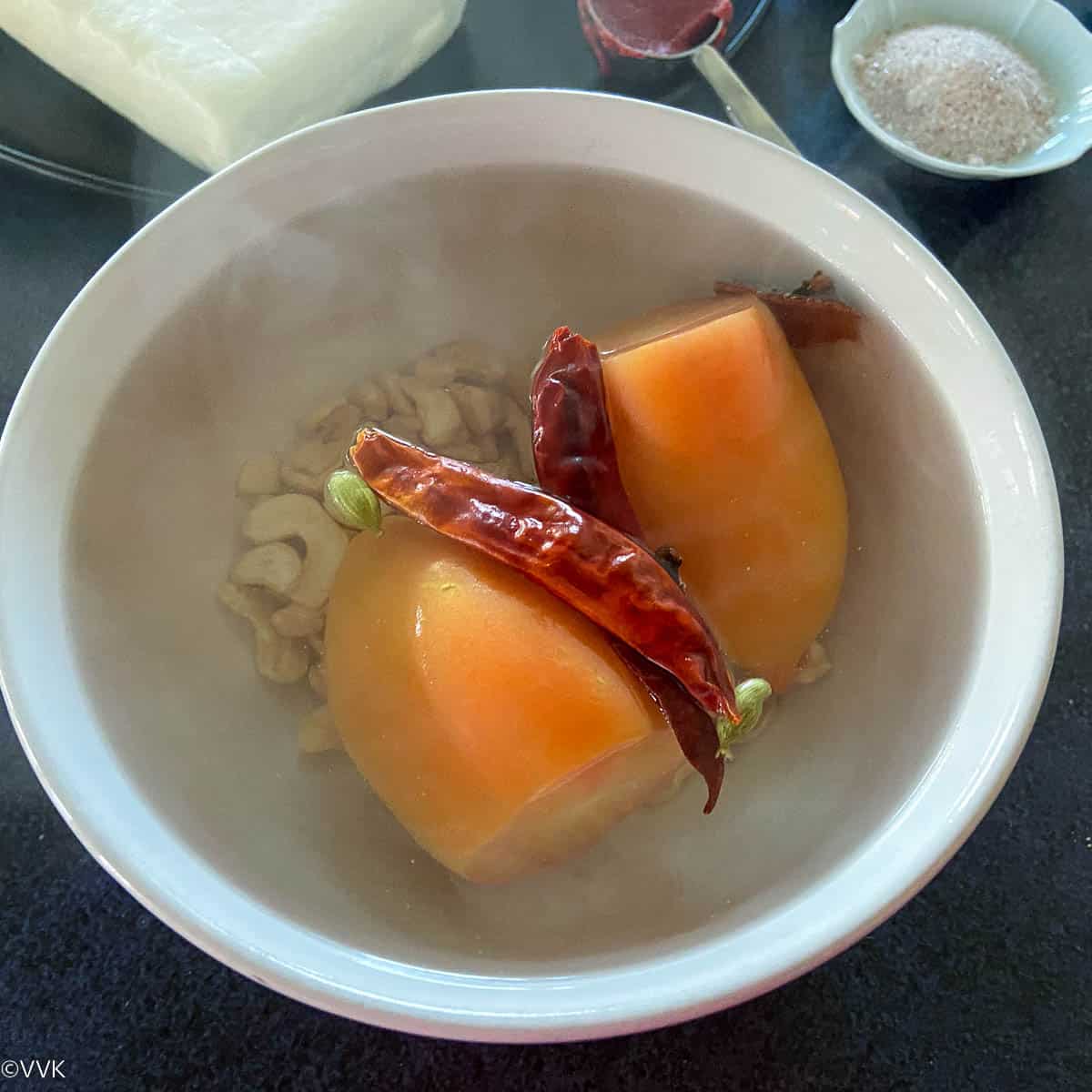 To soak: To prepare the gravy base, we need to soak and grind a few ingredients. We soak the whole spices – cinnamon, cloves, cardamom, cashews, dried red chilies and tomatoes in hot water for 30 to 40 minutes. Soaking helps the tomato skin to come off quickly.