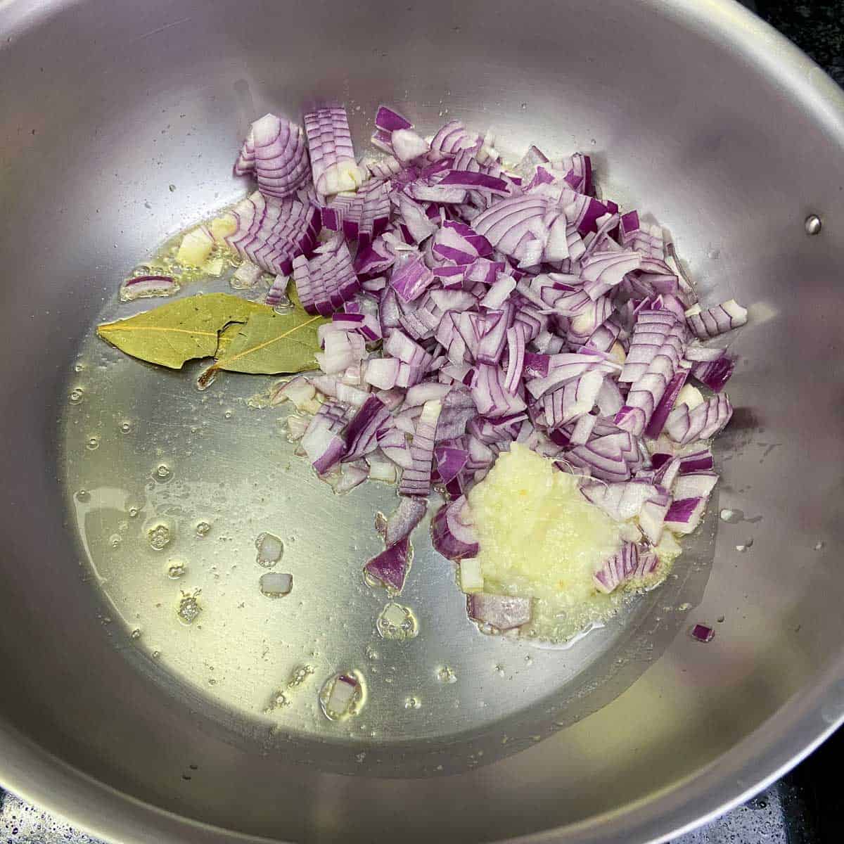 - Heat a pan or kadai and add the butter. Let the butter melt, and add the dried bay leaves, chopped onion, and ginger garlic paste.