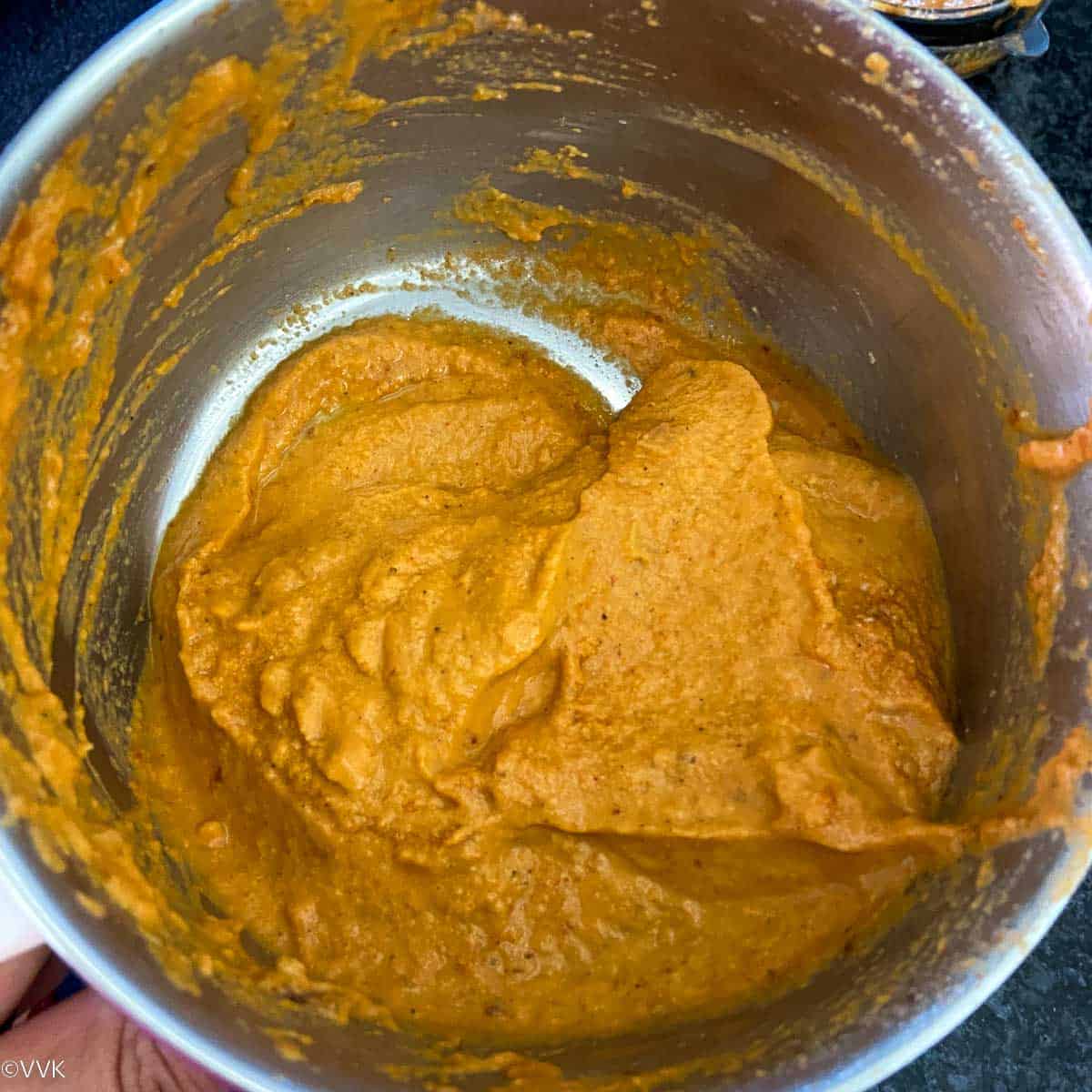 - Now add the ground paste and rinse the mixer jar with ¾ cup of water and add it. Mix well, partially cover, and cook this spice paste for 5 to 7 minutes over medium-low heat. Keep mixing in between so that it doesn’t stick to the bottom.
