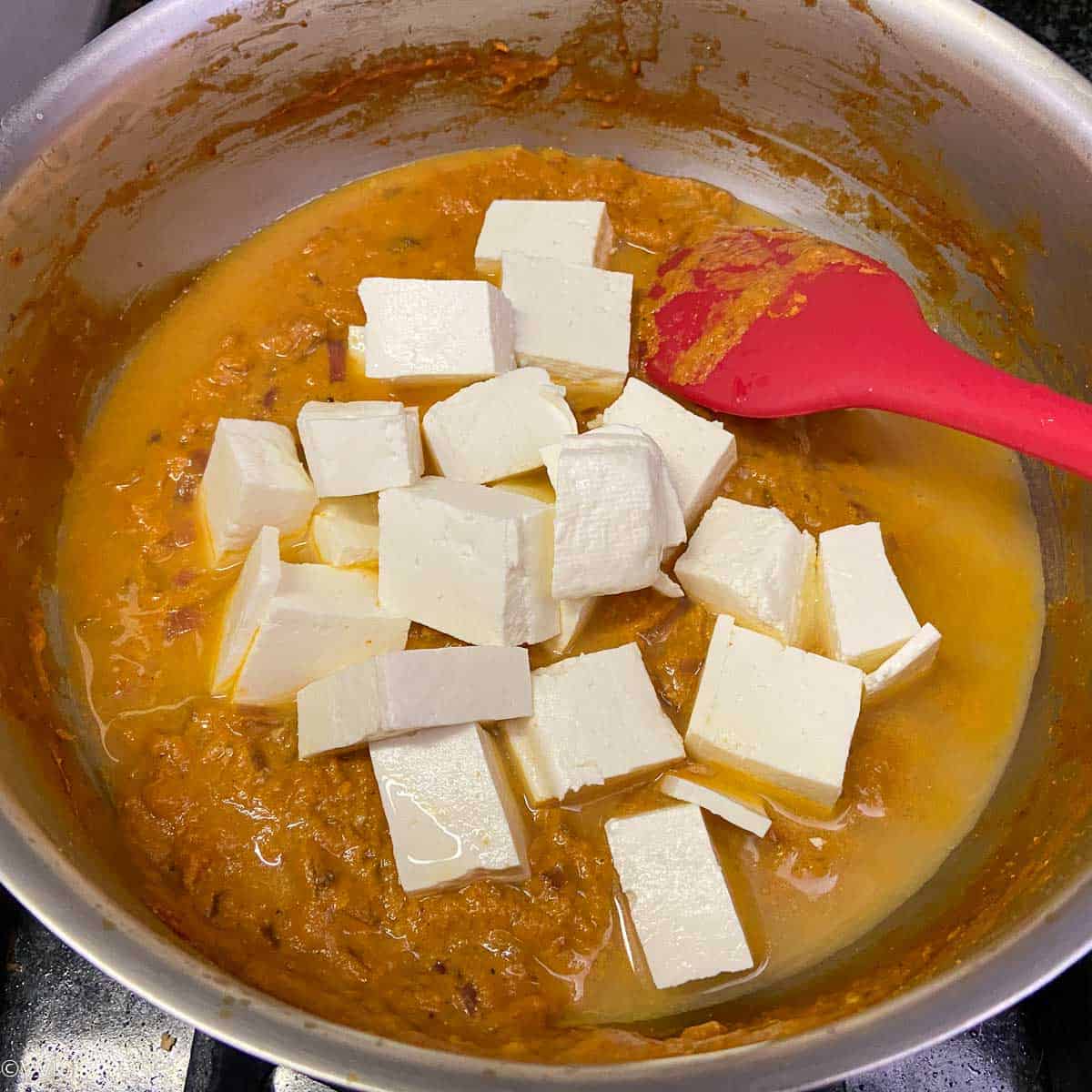 - Then add the paneer cubes and ¼ cup of water. Cook again for 3 to 4 minutes.