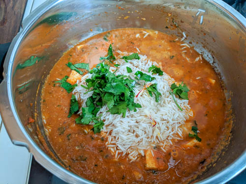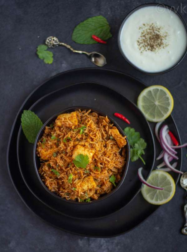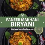 Don’t worry; this biryani is still mild. Thanks to the saffron soaked milk and the creamy cashew paste. This biryani is not spicy at all, and everyone including kids can enjoy this paneer makhani biryani. If you don’t want to make biryani, after adding the cashew puree, add ½ cup of water and saffron soaked milk or heavy cream for a rich paneer makhani. Serve it with rice, roti or naan.