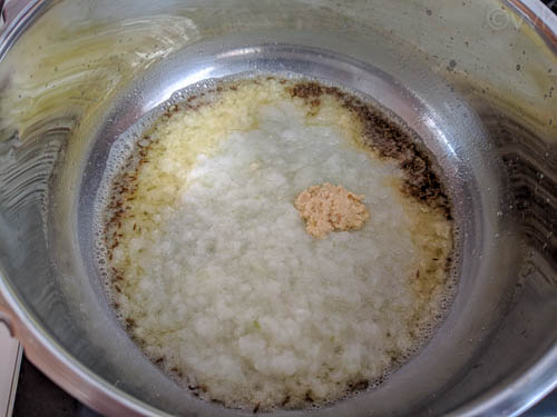 - Then add the cumin seeds, onion paste, and the ginger-garlic paste. Cook until the raw smell goes off. It took me about 8 minutes.