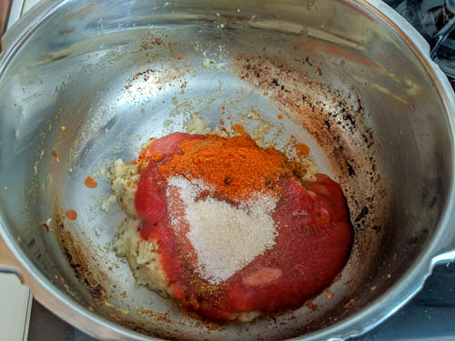 - Next add the tomato puree, red chili powder, garam masala, tandoori masala, sugar, and salt — Cook for 3 to 4 minutes.