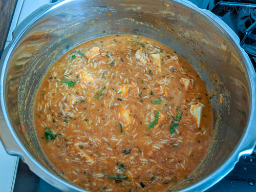 - Followed by 1 cup of the reserved water used for rinsing the mixer jar and the rice, cilantro and saffron milk.