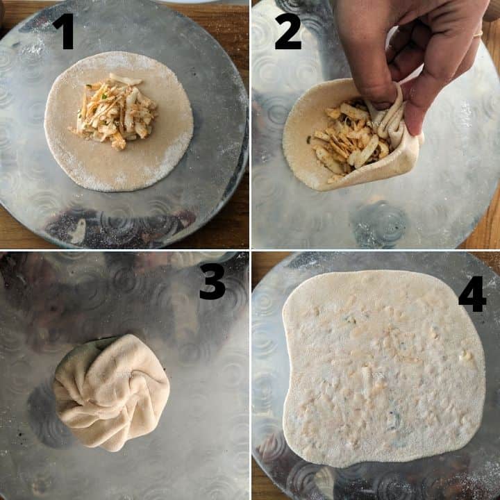 - Bring all the edges in a pleated/folded fashion towards the center. Usually, all the recipes call to pinch off the excess dough as we fold and bring the edges to the center. But I don’t do that. I just press the excess dough and flatten it.