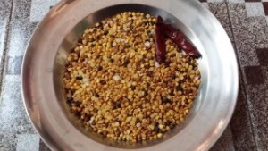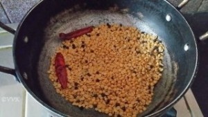- Dry roast toor dhal, red chilies, and black pepper till toor dhal turns brown.
