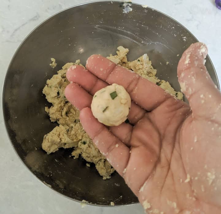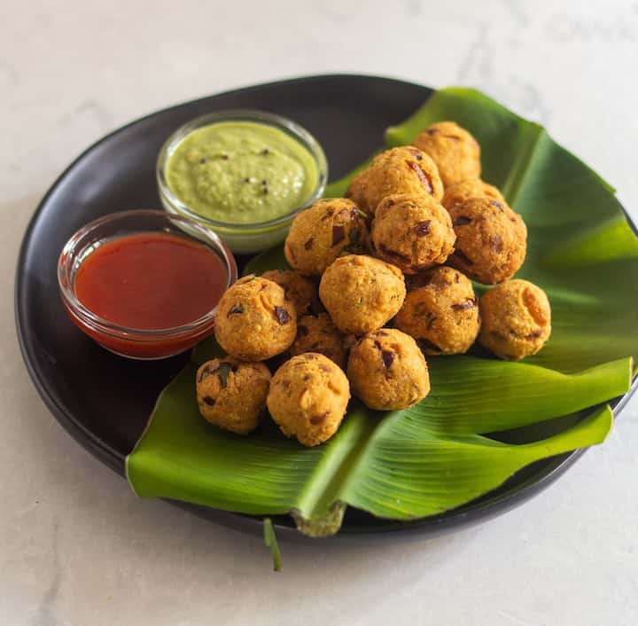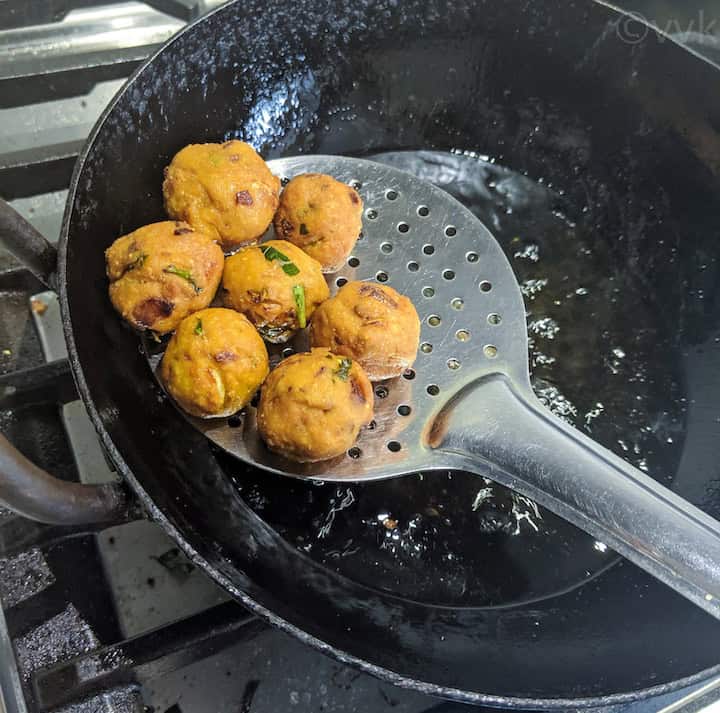- Heat the oil for frying. Meanwhile, take a small portion of the dough and roll into small balls (small gooseberry size would do). Similarly, roll the balls with the remaining mixture and keep it ready for frying.