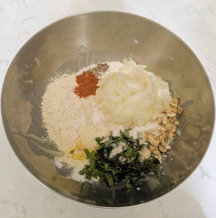- Now add the other ingredients as well – rice flour, roasted gram flour, besan, onion, ginger, green chili, cilantro, curry leaves, mint leaves, cumin seeds, salt, and red chili powder.