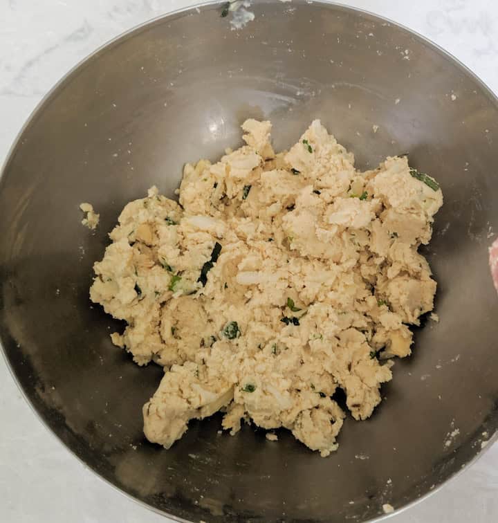 - Mix them all. Sprinkle water little by little and mix to form a soft yet firm dough. Add water as required. I used ⅓ cup + 1 tbsp. You need ⅓ to ½ cup for this measure.
