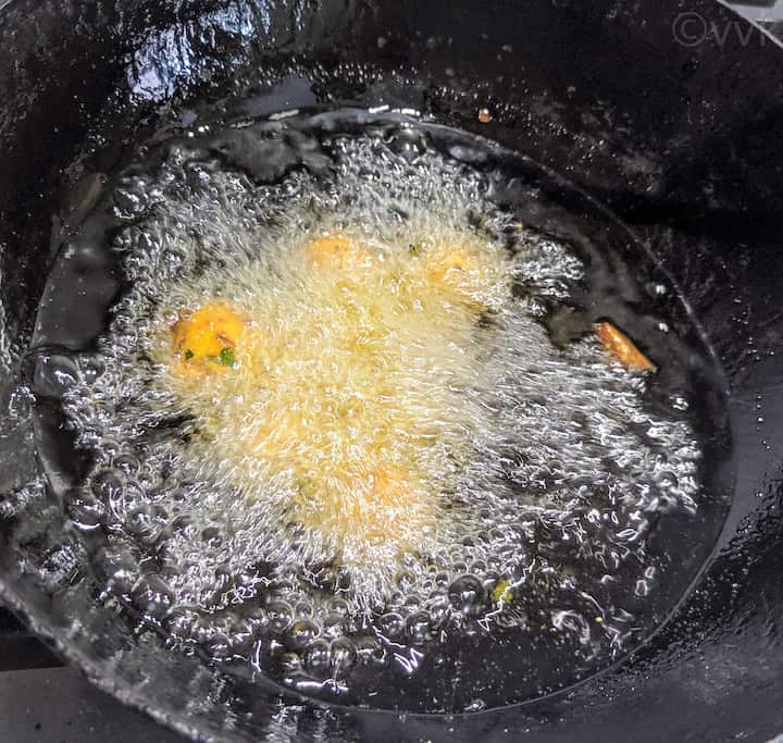 - When the oil is hot, slowly drop the pakodas in batches and fry in medium heat till they turn golden brown and crisp.