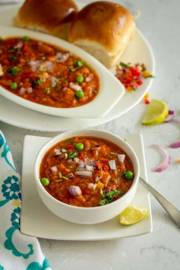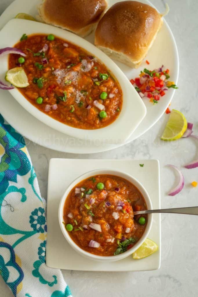 Usually, bhaji is served hot with a dollop of butter and some lime wedges, diced/sliced onions, and the toasted pav buns. You can use store-bought pav buns, or you can make it at home as well. I have the wheat pav buns recipe on my blog.