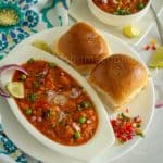 This lip-smacking spicy mixed-vegetable curry served along with dinner rolls, also known as pav, is a perfect party pleaser recipe and perfect for a weekday brunch, lunch, or dinner.