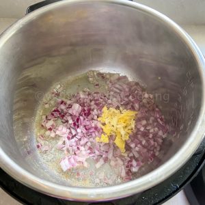 - Set the Instant Pot in saute mode, and after 30 seconds, add the oil and 1 tbsp of butter. Let the butter melt and when the oil is hot, add the finely chopped onion, garlic, and ginger. Saute for 3 to 4 minutes.