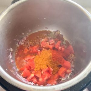 - Mix 1 tbsp of tomato paste with ⅓cup of water without any lumps. Add this tomato paste water, chopped tomatoes, pav bhaji masala, salt, and red chili powder.