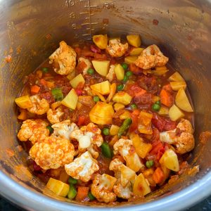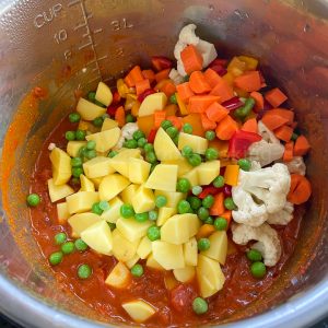 - Now add all the veggies – potatoes, peas, cauliflower, carrots, and bell peppers.