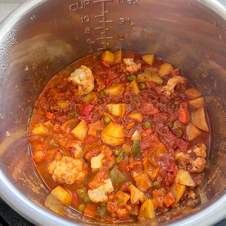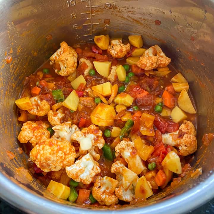 - Now add all the veggies – potatoes, peas, cauliflower, carrots, and bell peppers. Add the remaining ⅔ cup of water and mix well.